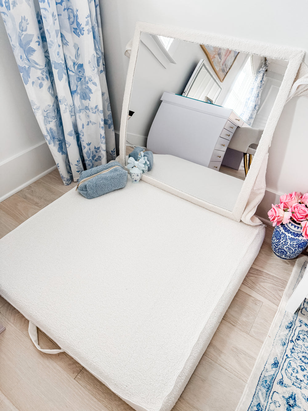 Super soft teddy bear fabric on top of a thick memory foam cushion makes getting ready on the floor easy and comfortable!